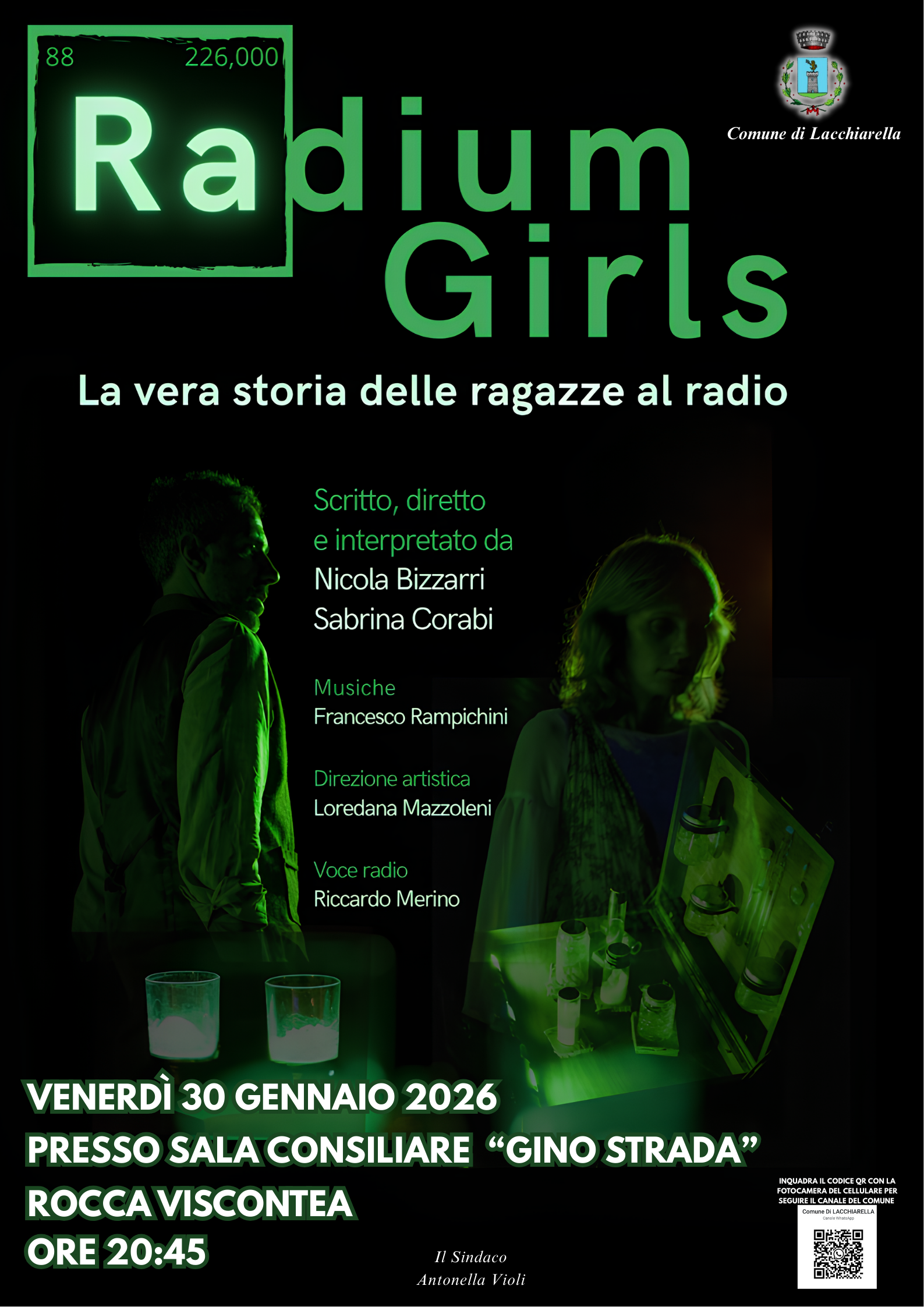 Spettacolo "Radium Girls. La vera storia delle ragazze al radio". Anni venti del '900. La U.S. Radium Corporation assume centinaia di ragazze come pittrici di quadranti degli orologi destinati ai soldati. La vernice utilizzata è innovativa, brilla nel buio ma contiene una terribile insidia: la presenza di radio. Una storia bella che parla di donne, di coraggio e di lotta per la giustizia.